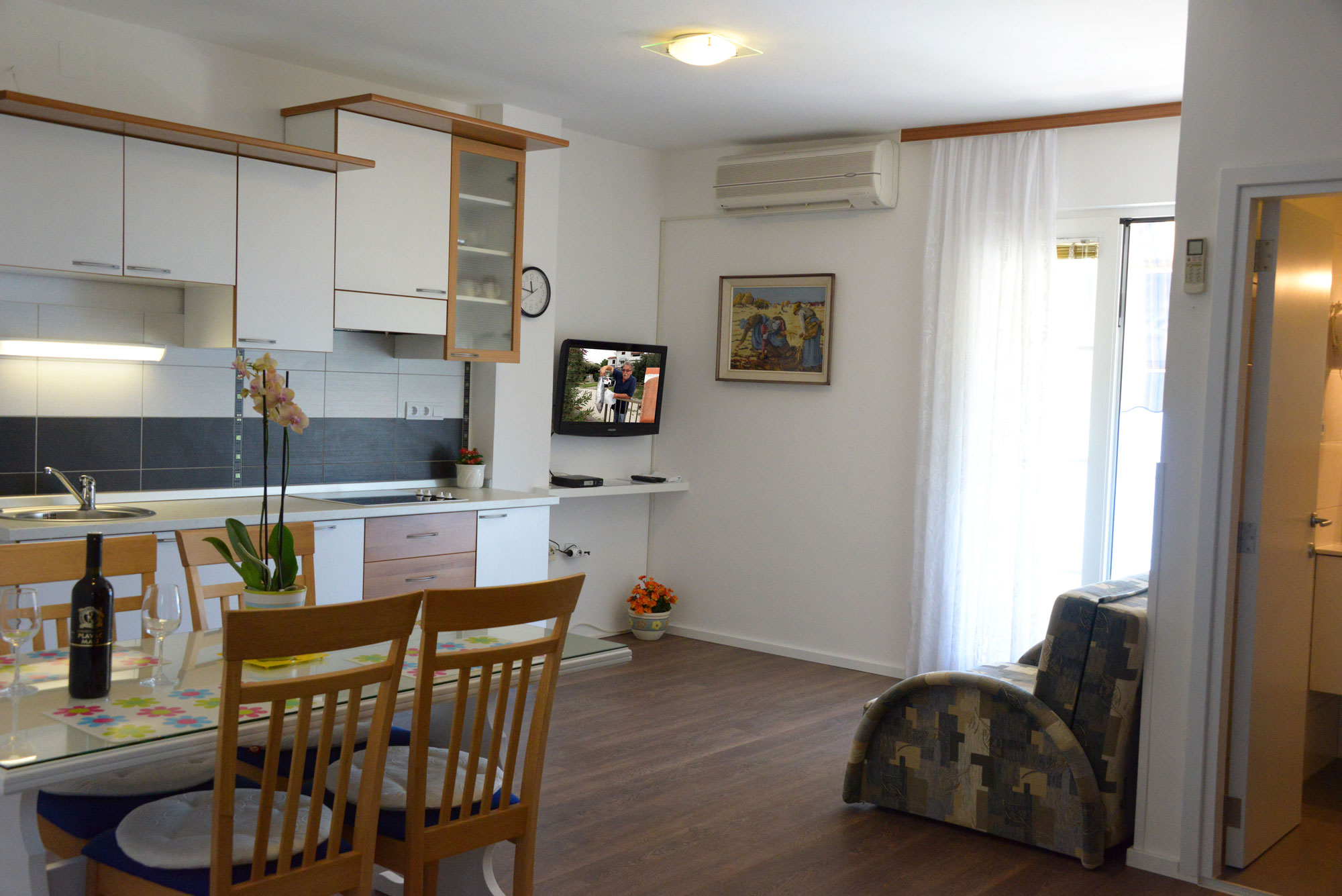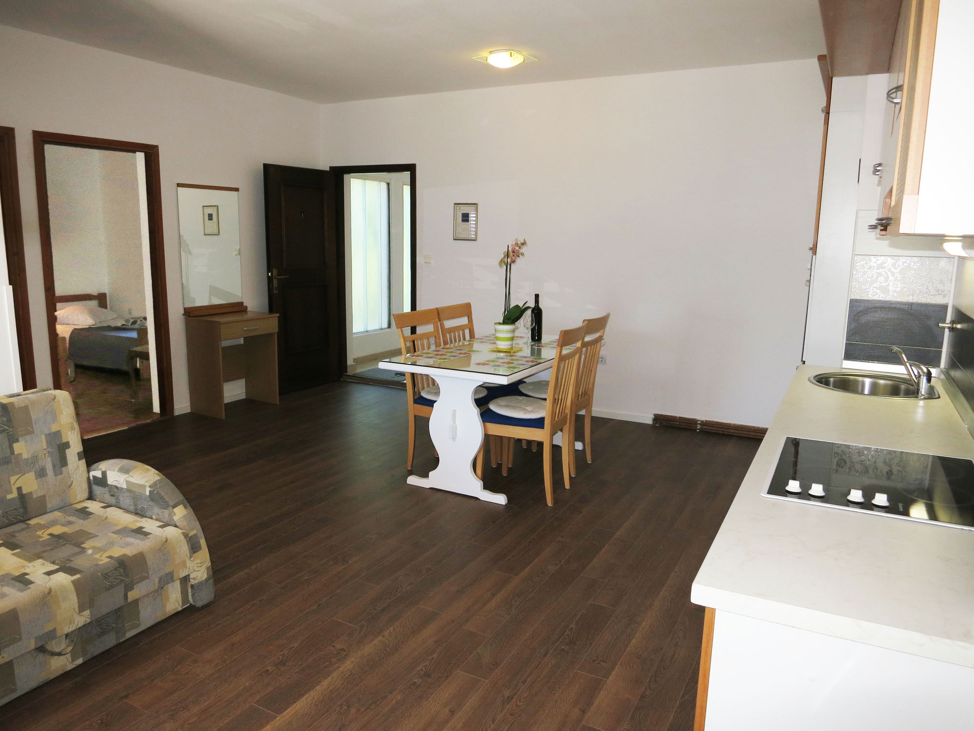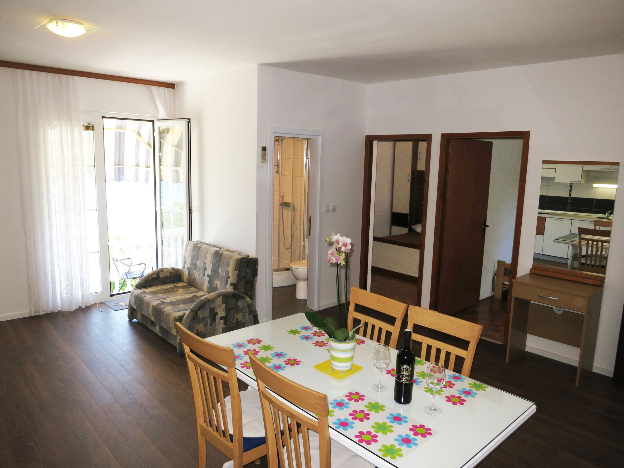 Apartment A1, located on the 1st floor consists of two bedrooms, one with double bed, another with two single beds. It has a bathroom with shower, a balcony with a sea-view, and living + dining room with kitchen. Within a living + dining room, there's a sitting area with sofa, which can be turned into fifth bed. Kitchen is fully equipped with: refrigerator with freezere, stove, oven, complete cutlery set, set of cups and glasses, set of pots, a dishwasher, coffee maker for filter coffee, kettle for boiling water.