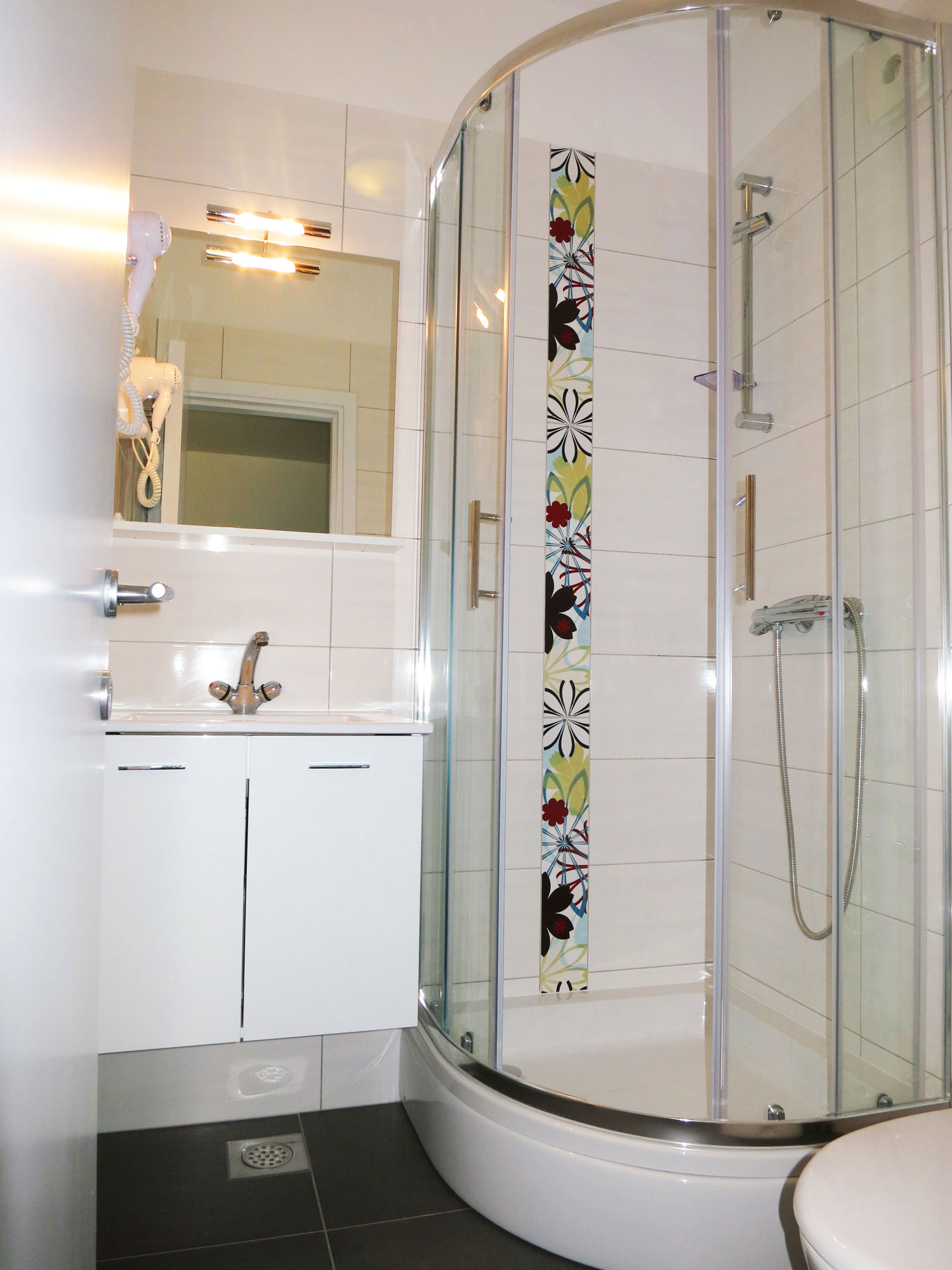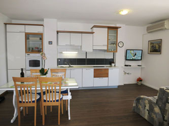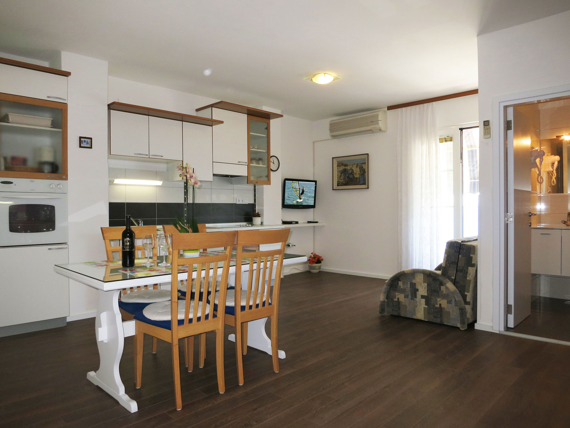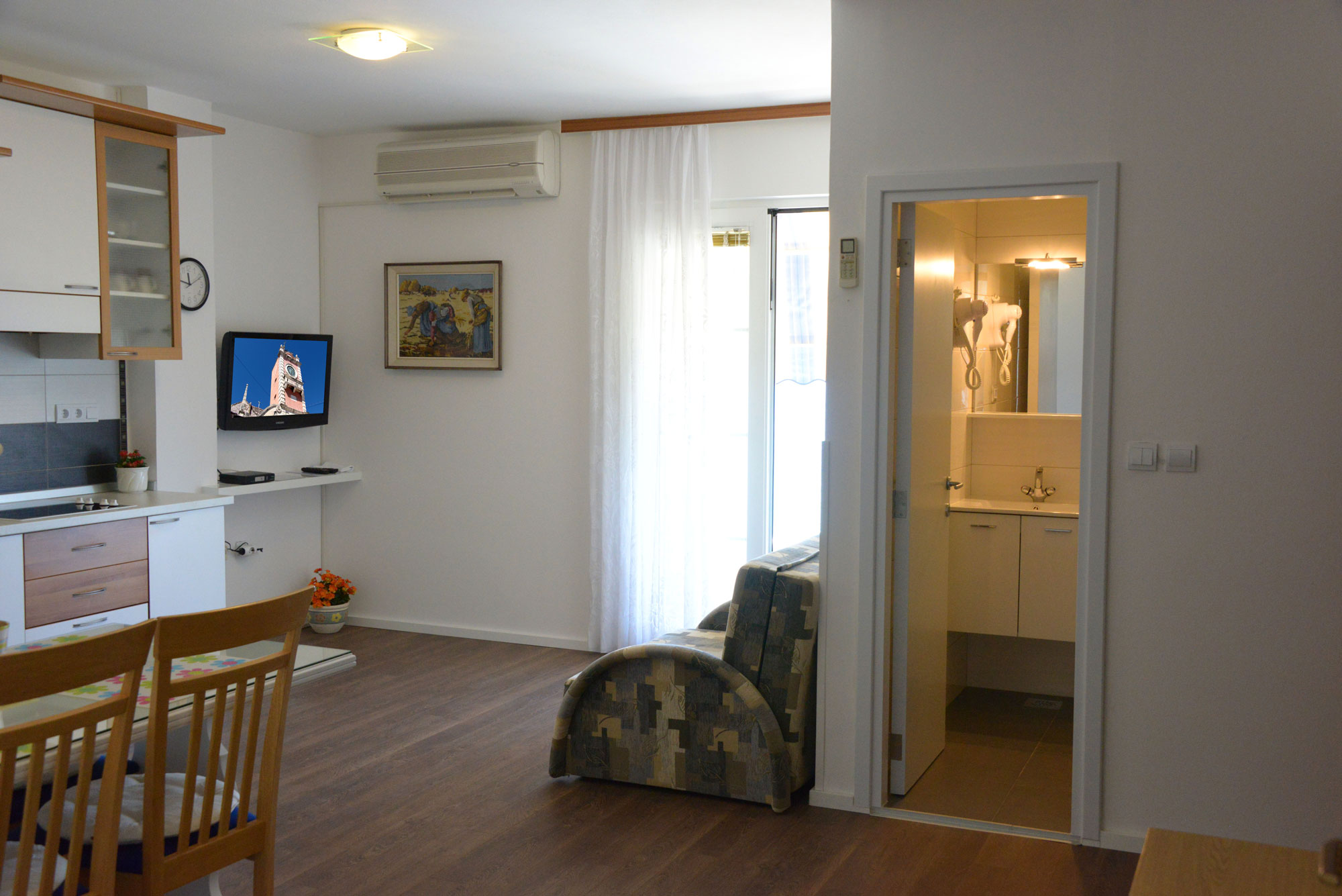 Apartment A1, located on the 1st floor consists of two bedrooms, one with double bed, another with two single beds. It has a bathroom with shower, a balcony with a sea-view, and living + dining room with kitchen. Within a living + dining room, there's a sitting area with sofa, which can be turned into fifth bed. Kitchen is fully equipped with: refrigerator with freezere, stove, oven, complete cutlery set, set of cups and glasses, set of pots, a dishwasher, coffee maker for filter coffee, kettle for boiling water.