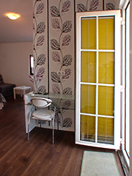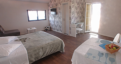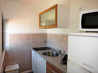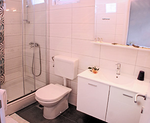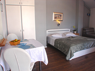 Apartment A3 is a studio apartment located on the 2st floor. It occupies standardly 2 persons which sleep on a double bed. The 3rd person sleeps on a sofa bed and is extra charged. Apartment has a bathroom with shower, a balcony with a sea-view, and a sleeping + living room with dining area and kitchen. Within a sleeping + living room, there's a sitting area with sofa by the TV. Kitchen is equipped with: refrigerator with freezer, electric stove, microwave oven, complete cutlery set, set of cups and glasses, set of pots, coffee maker for filter coffee, kettle for boiling water.