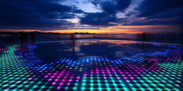 "The monument of the Sun" or "Greetings to the Sun" (Croatian: "Spomenik suncu" or "Pozdrav suncu"), probably the most beautiful monument dedicated to the Sun that exists on the Earth, is a symbolic urban installation which, by means of photovoltaic cells built-in sea walkway, changes solar energy into lighting spectacle.