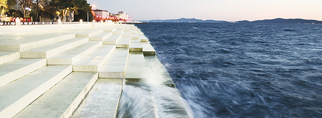"The Sea organ" (Croatian: "Morske orgulje") is an architectural object located in Zadar, Croatia and a first musical instrument of its kind in the world, which plays music by way of sea waves and tubes located underneath a set of large marble steps.