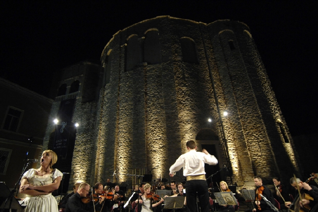 Famous pre-Romanesque church of St. Donatus from the 9th century at ROMAN FORUM, at day and at night, where many concerts take place under the clear summer night sky